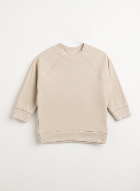 A modelagem soltinha oversized, agora com mangas raglan e gola mais fechadinha, cria um caimento confortável e atual, que envolve sem apertar.