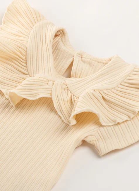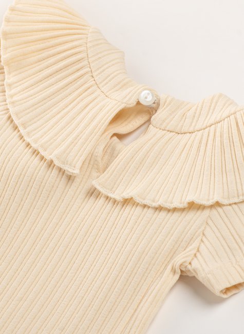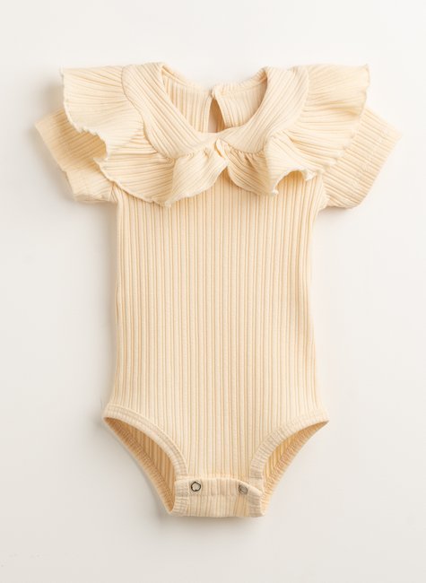 Na cor baunilha, transmite leveza e ternura, enquanto o babado fru fru na gola rouba a cena, um detalhe encantador que torna o body ainda mais especial.