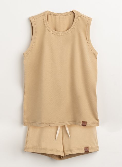 O conjunto compõe 01 Regata + 01 Short em meia malha 100% algodão.