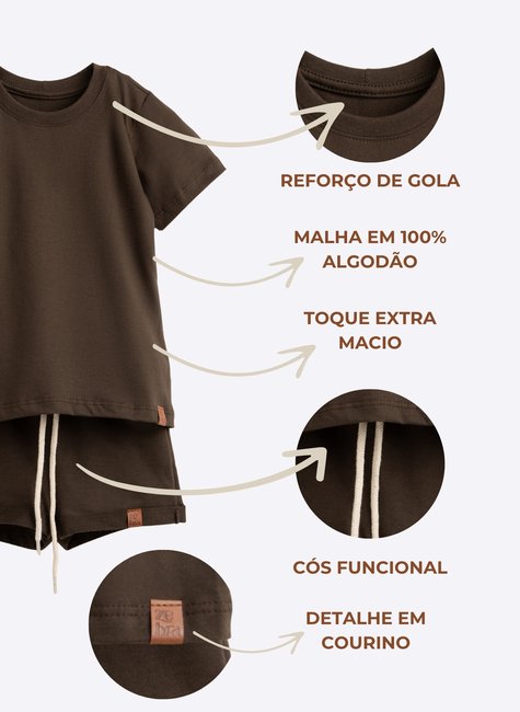O conjunto compõe 01 Camiseta em meia malha 100% algodão + 01 Short em meia moletinho 100% algodão.