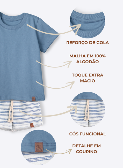 O conjunto compõe 01 Camiseta em meia malha 100% algodão + 01 Short em moletinho com fibras diversas.