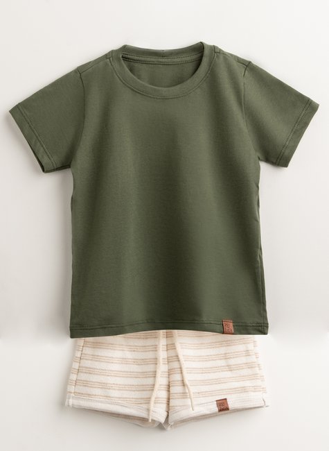 O conjunto compõe 01 Camiseta em meia malha 100% algodão + 01 Short em moletinho com fibras diversas.
