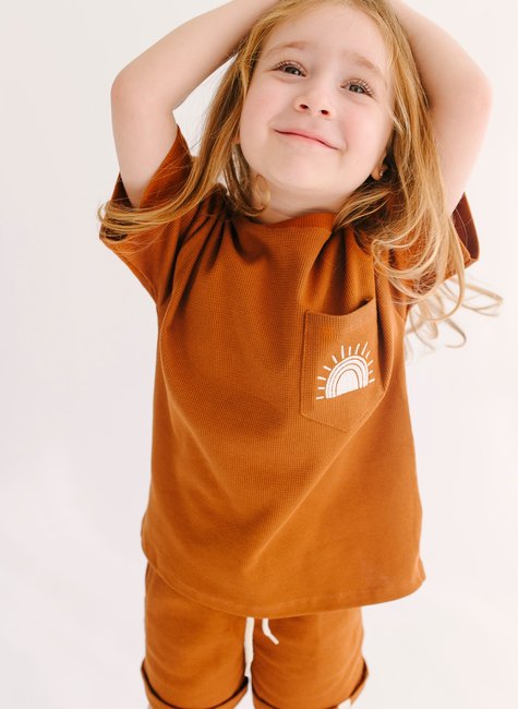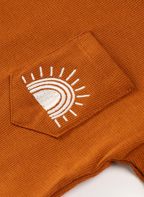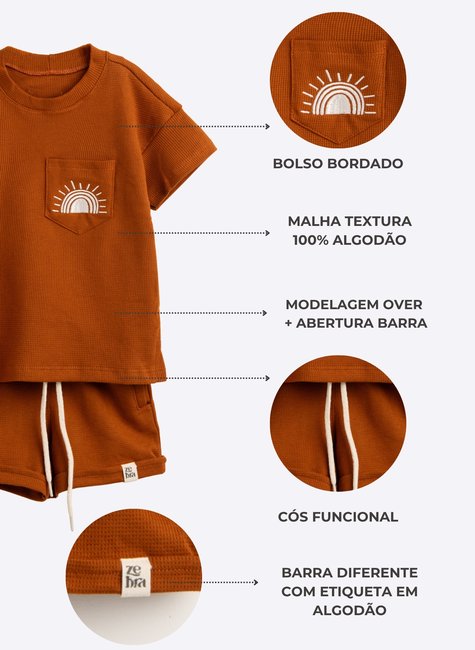 A textura traz um toque fashion e elegante ao conjunto, e o bordado de raio de sol é responsável pela autenticidade do mesmo! A estampa é uma fofura, e um lembrete de que os pequenos são o toque de cor e alegria nas nossas vidas!
