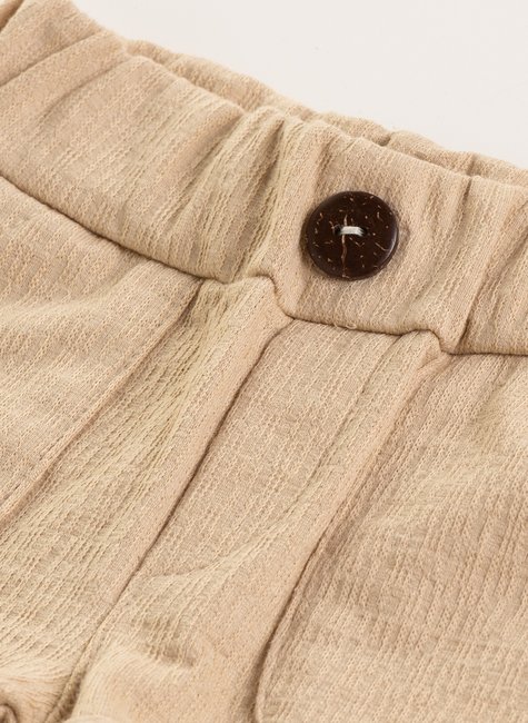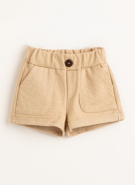 Um short onde cada detalhe conta uma história: a textura delicada, o cós largo que envolve com conforto, o charme do botão central, bolsos prontos para guardar lembranças da infância e a barra virada que finaliza com personalidade.