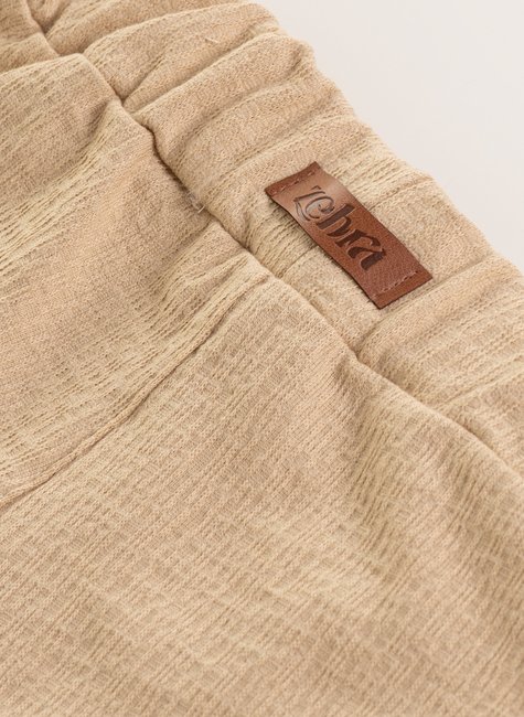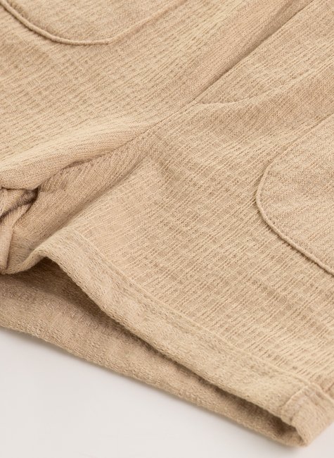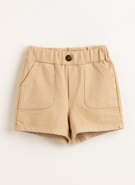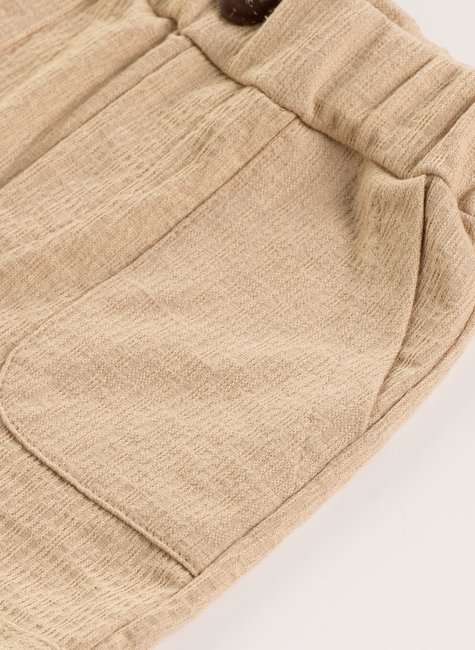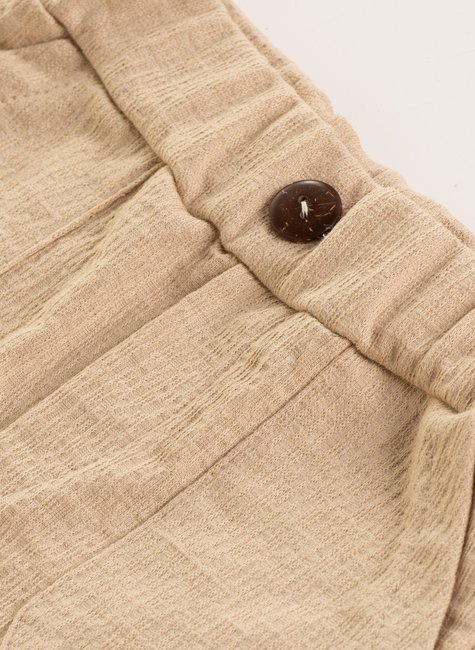 Um short onde cada detalhe conta uma história: a textura delicada, o cós largo que envolve com conforto, o charme do botão central, bolsos prontos para guardar lembranças da infância e a barra virada que finaliza com personalidade.